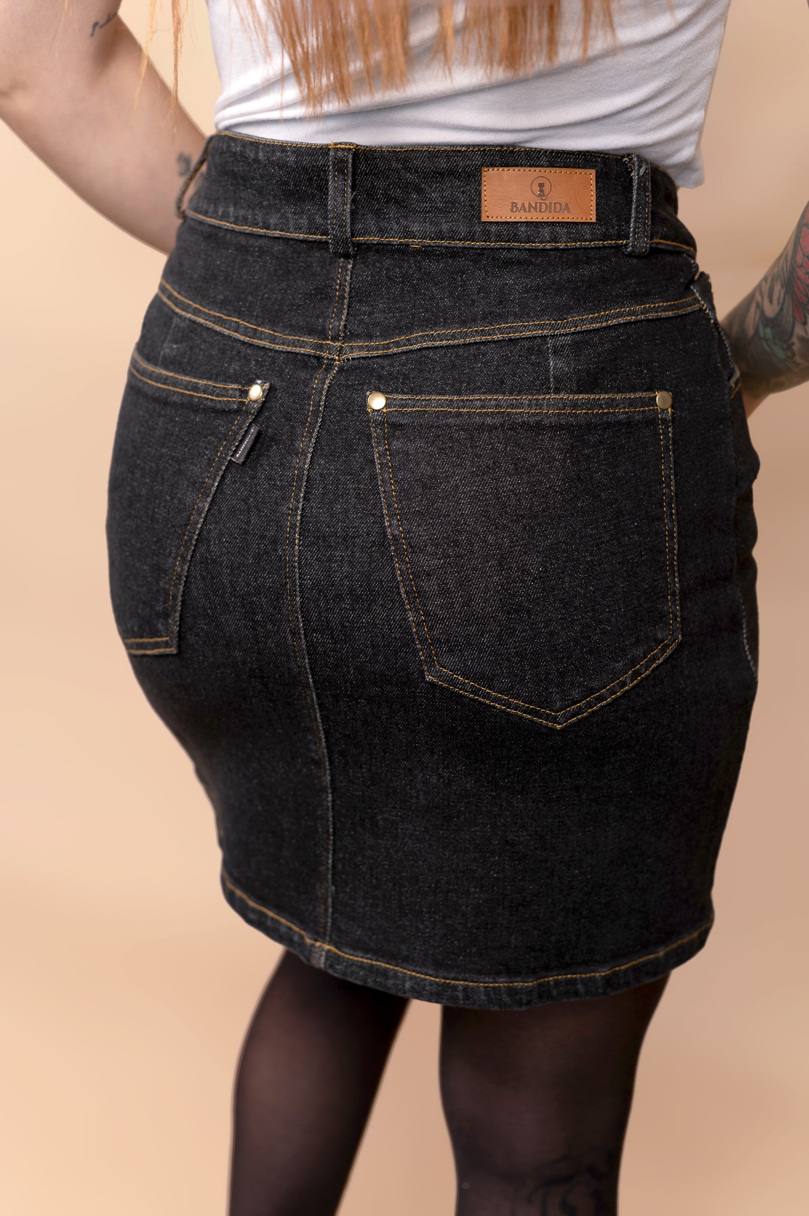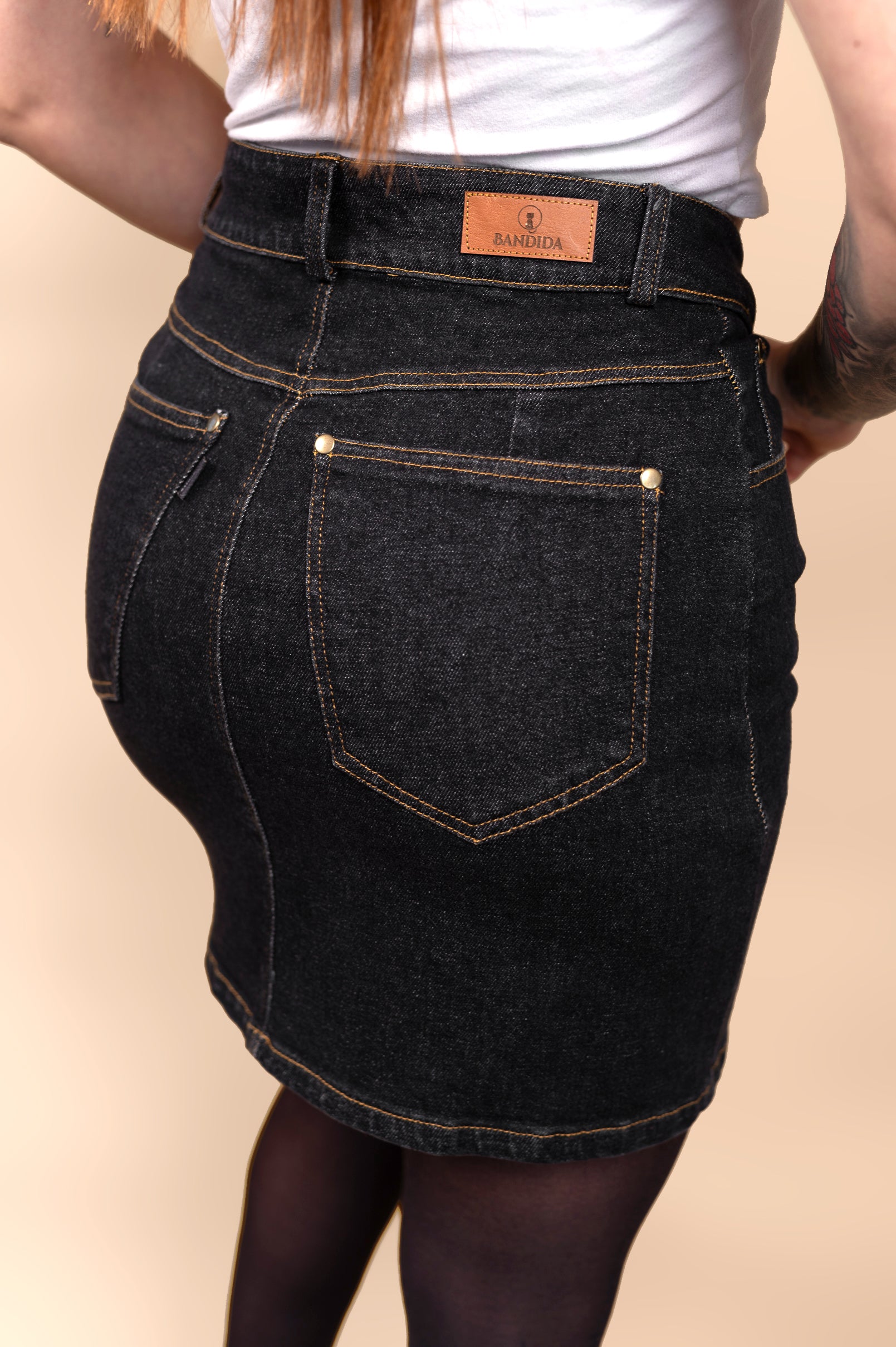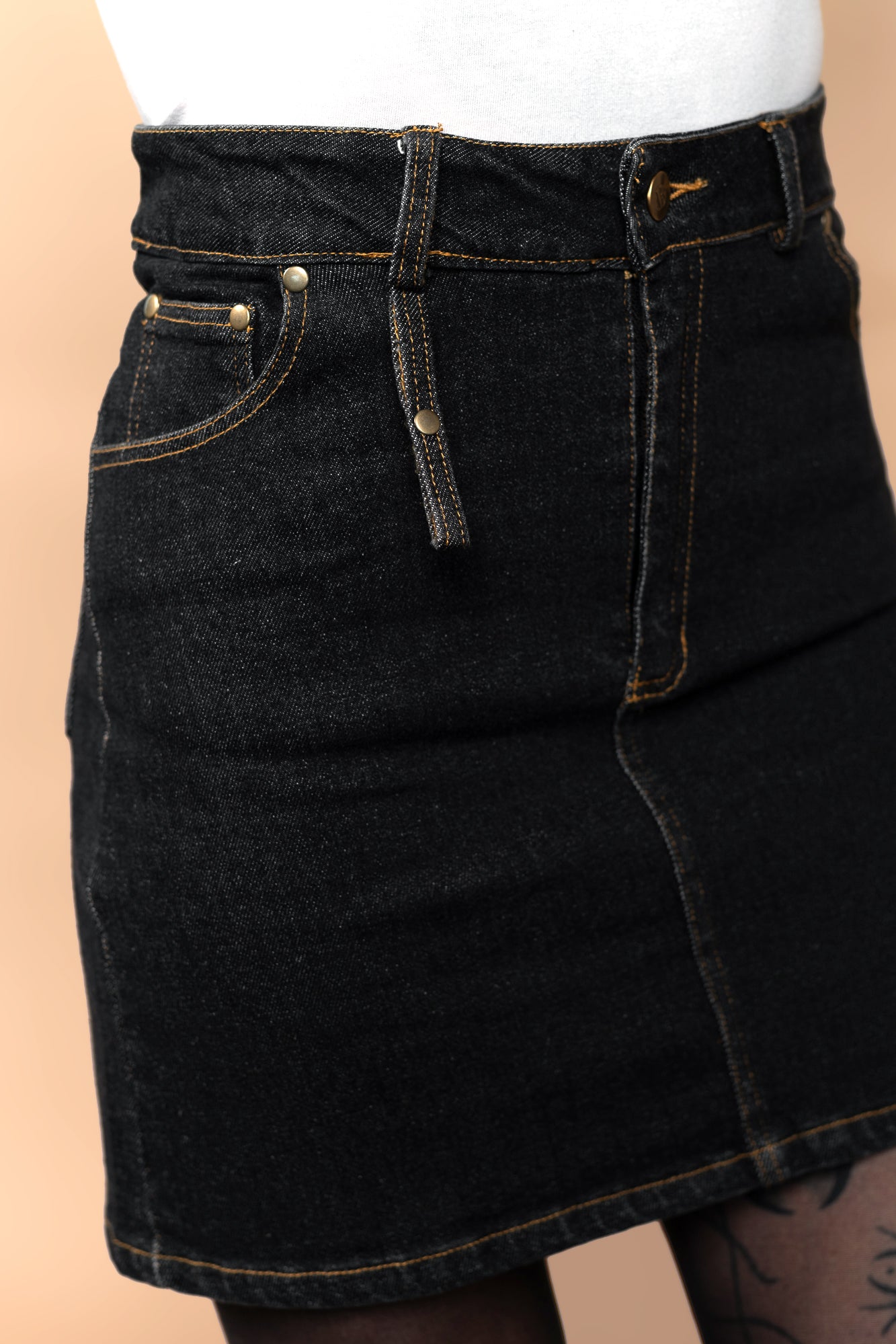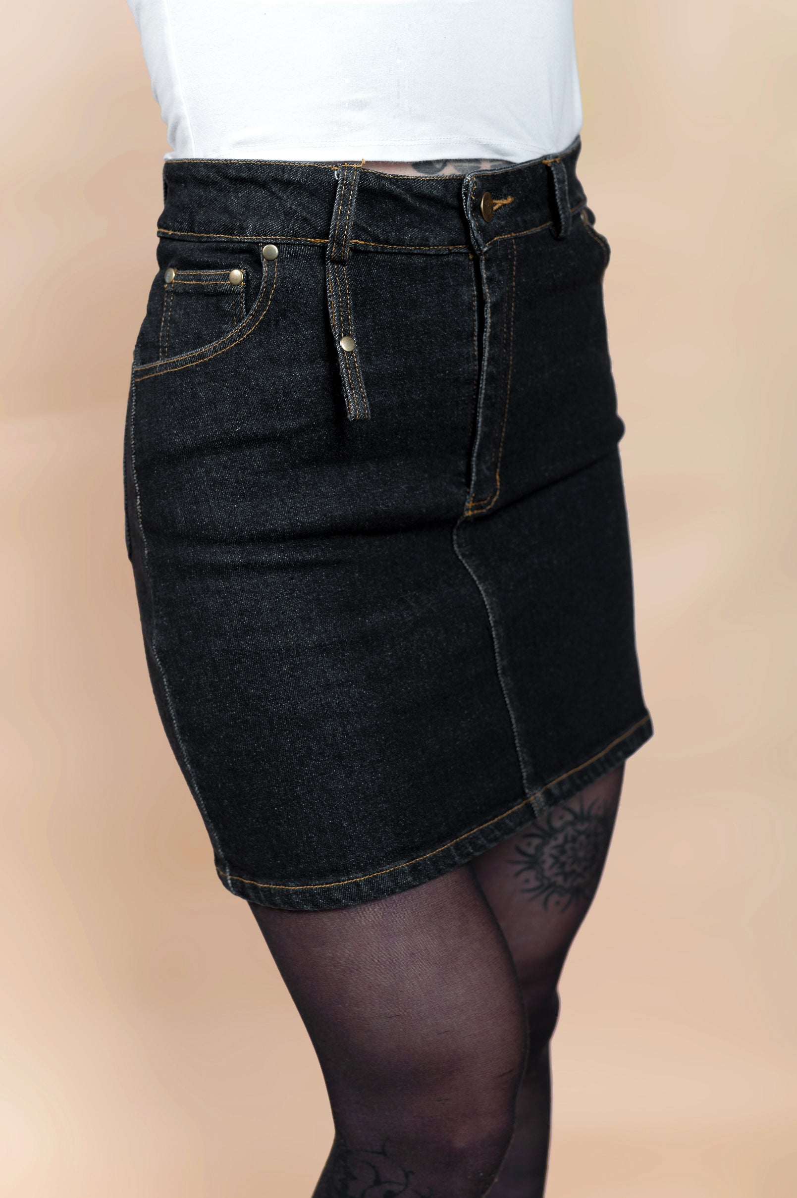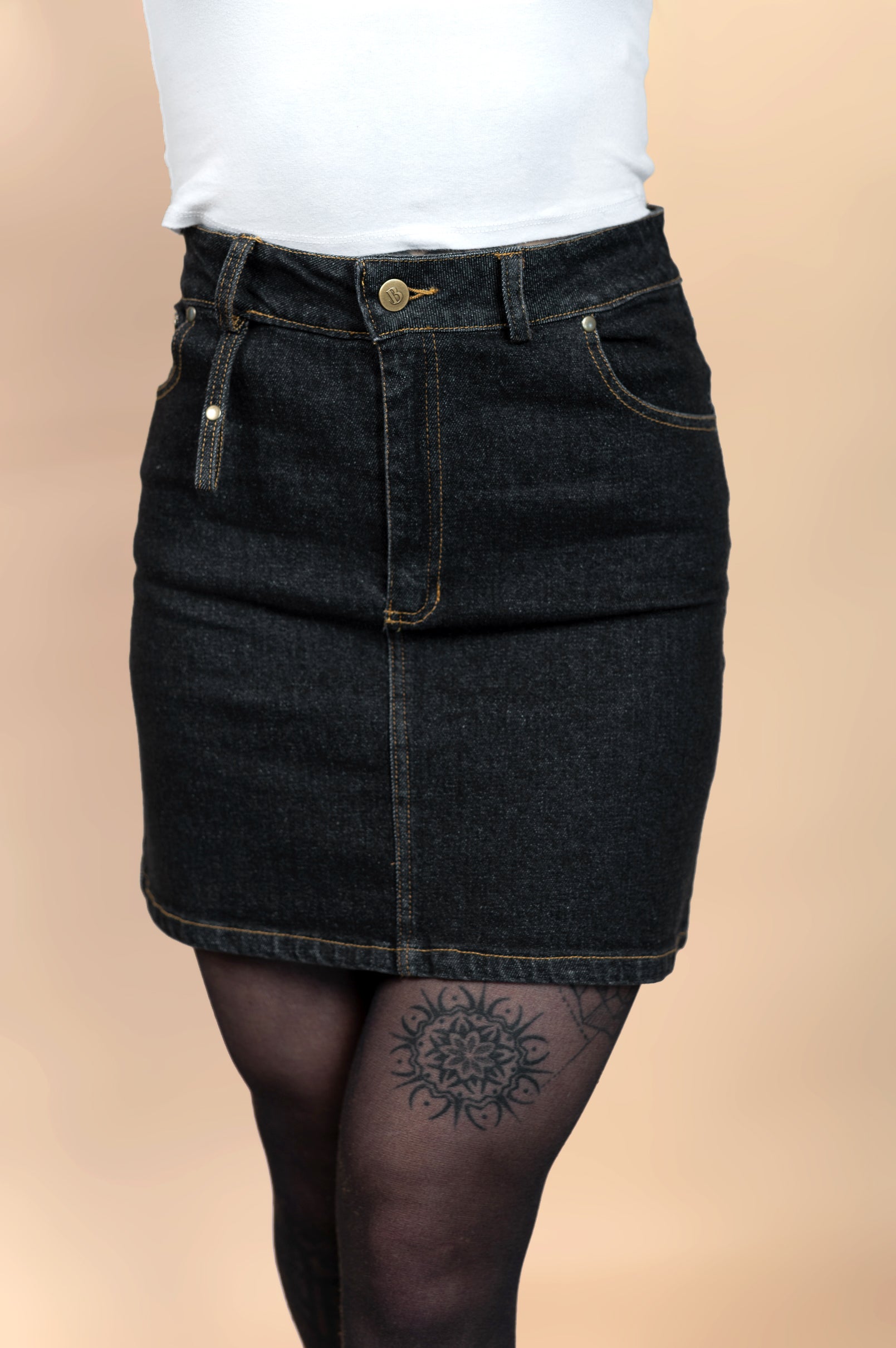 Minifalda de jean con spandex, estilo clasico. Talles 34 al 44 en azul y negro.