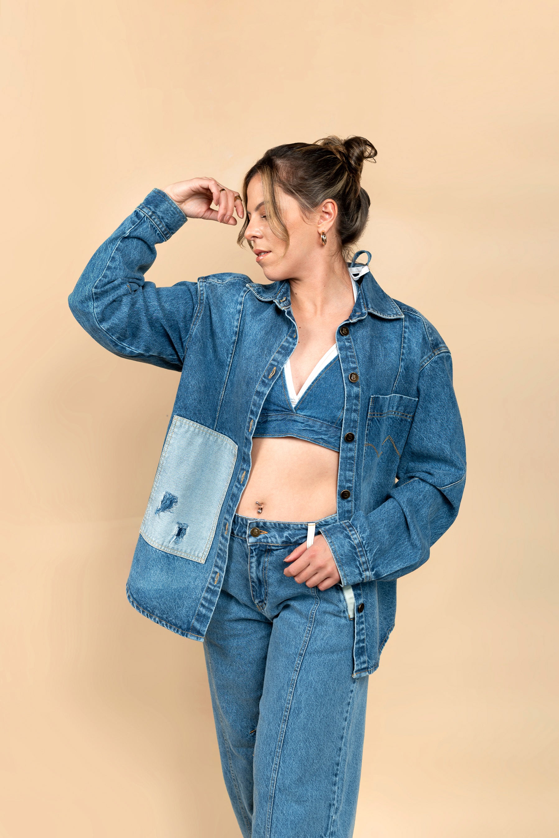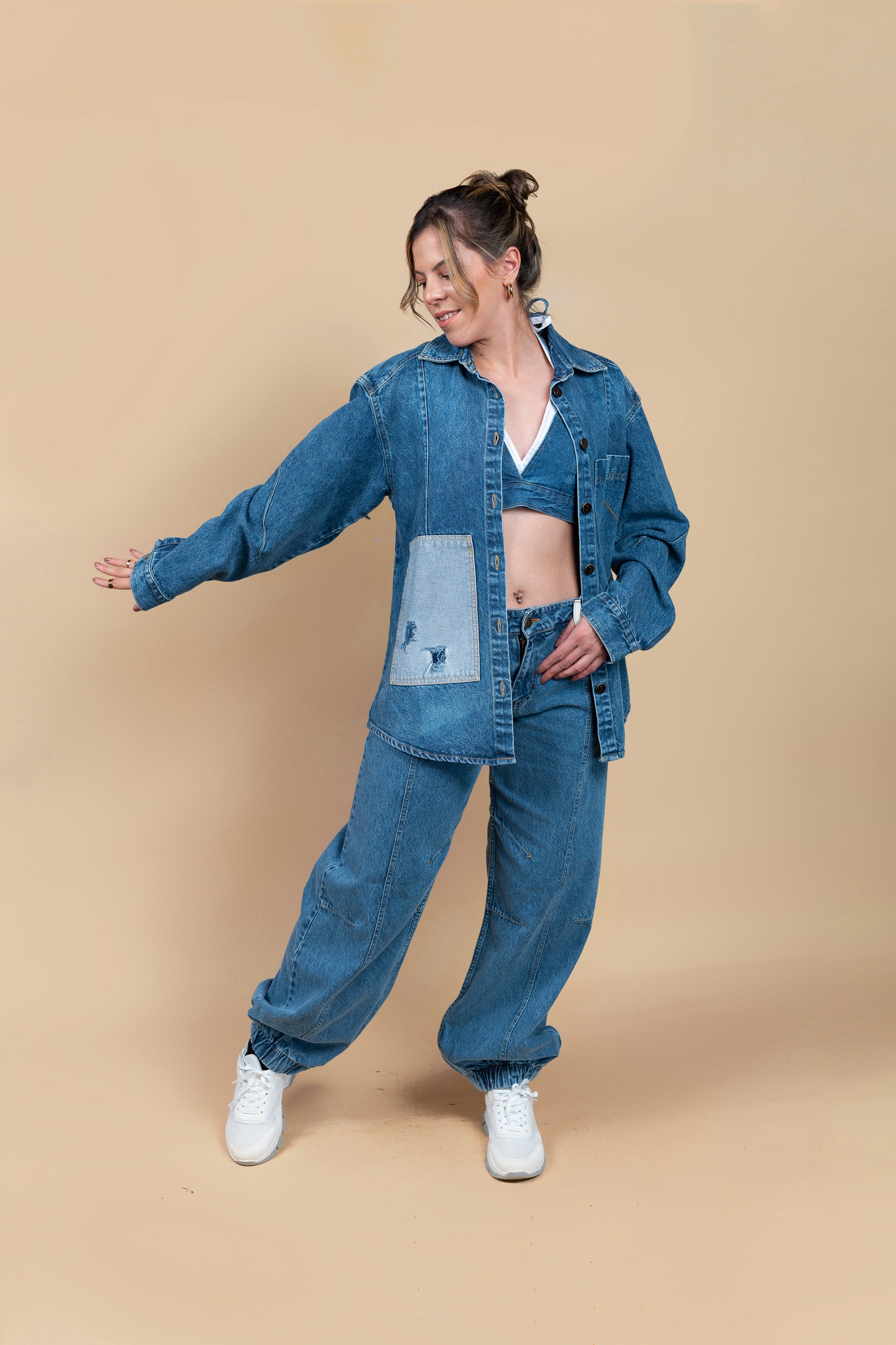 Sobre camisa oversize modelo Mishi con bolsillo grande, parche, 100% algodón y botones de metal